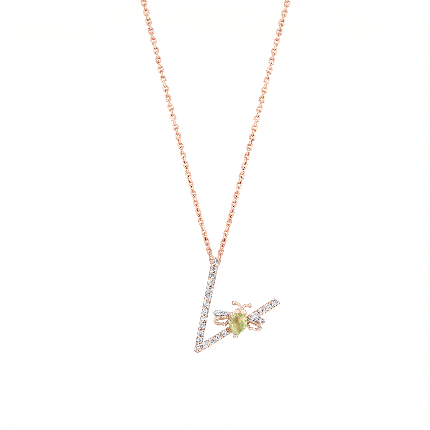 Embrace the essence of the divine feminine with the LETTER V GOLD DIAMOND PERIDOT NECKLACE, a radiant homage to the Queen Bee—an emblem of empowerment, beauty, and spiritual wisdom. Crafted in lustrous 14K rose gold, this exquisite piece features a delicate symbol, adorned with a shimmering 0.14 Ct diamond and a vibrant 0.19 Ct peridot, both chosen for their potent energies of joy and renewal. As the Queen of the Sun, she invites you to illuminate your path with love and light, fostering unity and abundance in all aspects of life. This necklace is not merely an accessory; it is a talisman—a reminder of your innate strength and the transformative power of collaboration and clarity. Let this enchanting piece serve as your spiritual companion, guiding you toward a life filled with pleasure, productivity, and growth. Adorn yourself with the magic of the Queen Bee and step into your radiant power—your journey of rebirth and rejuvenation awaits.