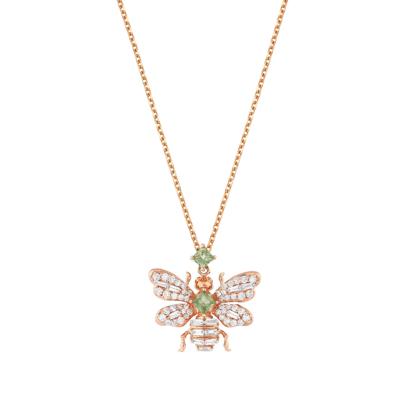 Embrace the essence of the divine feminine with the Queen Bee Rainbow Chakra Gold Diamond Peridot Necklace, a radiant talisman of empowerment and elegance. Handcrafted in luminous 14K rose gold, this exquisite piece features a delicate interplay of 0.26 ct G-VS-SI diamonds and the vibrant green hues of 0.24 ct peridot, harmonizing your energy and illuminating your spirit. Inspired by the powerful symbolism of the Queen Bee, this necklace embodies beauty, wisdom, and renewal, inviting you to embrace joy, abundance, and collaboration in your life. Just as the Queen Bee nurtures her hive, may this enchanting adornment remind you of your own capacity to inspire and uplift those around you. With an adjustable chain that drapes gracefully around your neck, let the Queen Bee necklace be a reminder of your innate strength and the continuous cycle of rebirth. Wear it as a symbol of your journey towards self-actualization, and allow your inner light to shine brilliantly. Step into your power—be the queen you are destined to be.