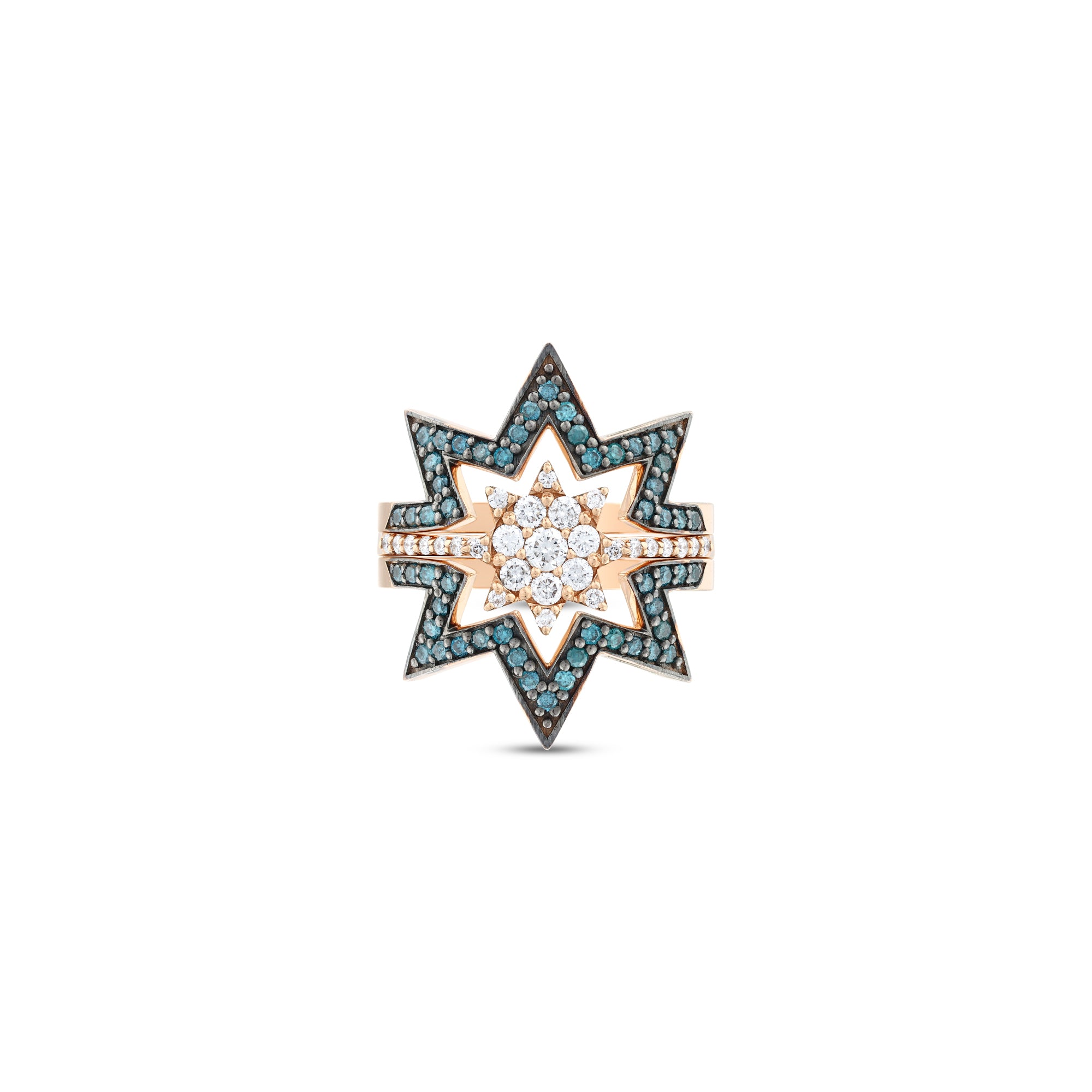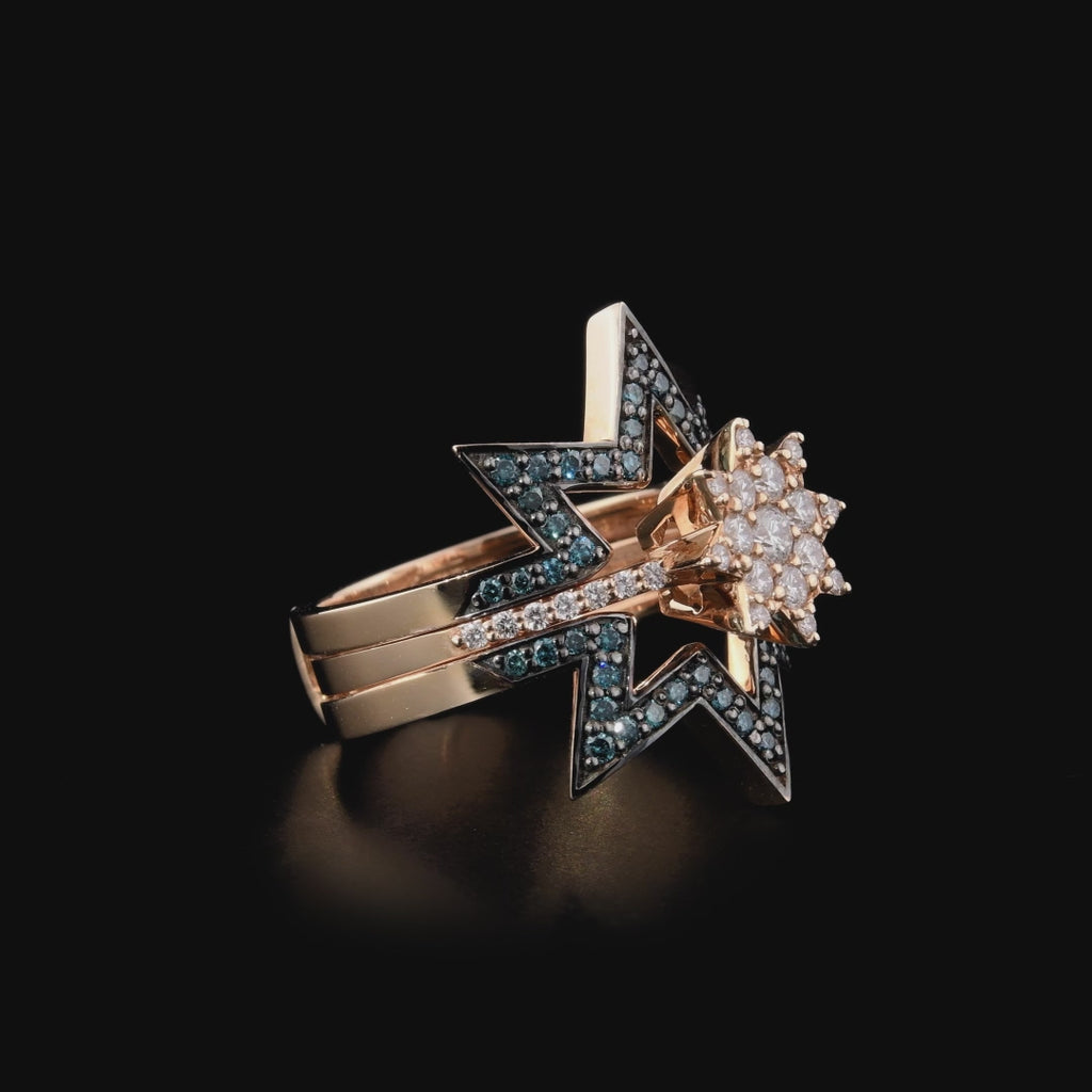 Embrace the transformative energy of the Venus Star Gold Blue Diamond Ring, a celestial emblem of love and renewal inspired by the goddess Ishtar, queen of the heavens. Crafted in resplendent 14K rose gold, this exquisite piece features a captivating interplay of luminous diamonds—0.43 carats of G-VS-SI diamonds and a striking 0.45 carat blue diamond, evoking the morning and evening star's enchanting glow. Each eight-rayed star represents a gateway to beauty, creation, and the profound power of attraction, inviting you to embark on a journey of intimate connection and personal rebirth. Adorning your finger, this ring becomes a talisman of equilibrium and splendour, reminding you of the love that illuminates your path and the new beginnings that await. Dare to shine brighter than the stars—let the Venus Star guide you towards your divine essence and empower your spirit. Wear this exquisite piece and awaken the goddess within.