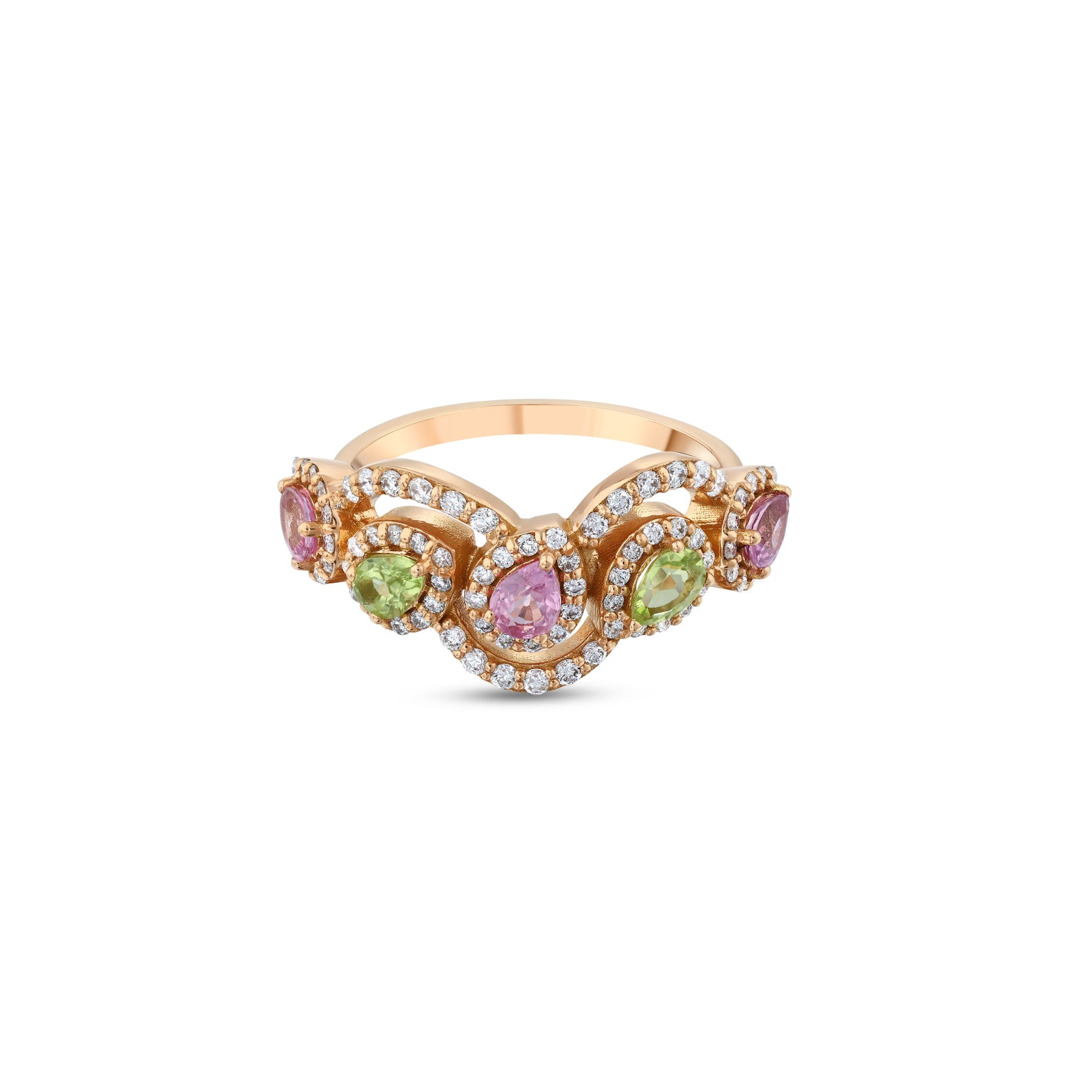Embrace the ethereal beauty of transformation with the Peacock Ring, a divine adornment crafted in sumptuous 18K rose gold. Adorned with the shimmering allure of 0.42 Ct G-VS-SI diamonds and the enchanting glow of 0.53 Ct pink sapphires, this piece embodies the spirit of Juno, the regal goddess of love and dreams. The peacock, a sacred messenger, invites you to awaken your inner potential, whispering secrets of self-expression, integrity, and boundless beauty. With each glance, immerse yourself in the energies of self-confidence, leadership, and spiritual awakening, embodying the essence of femininity that inspires nobility and vision. Let the radiant green of the 0.32 Ct peridot enhance your journey towards prosperity and eternal bliss. This exquisite ring is not just jewelry; it is a talisman of empowerment, urging you to embrace your divine path. Awaken the goddess within and let your dreams take flight—adorn yourself with the Peacock Ring and step into a realm where beauty knows no bounds.
