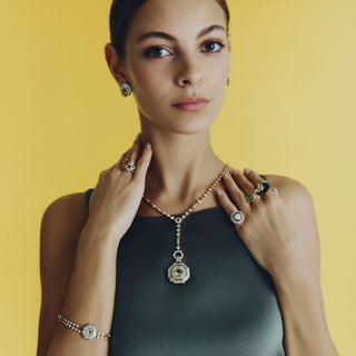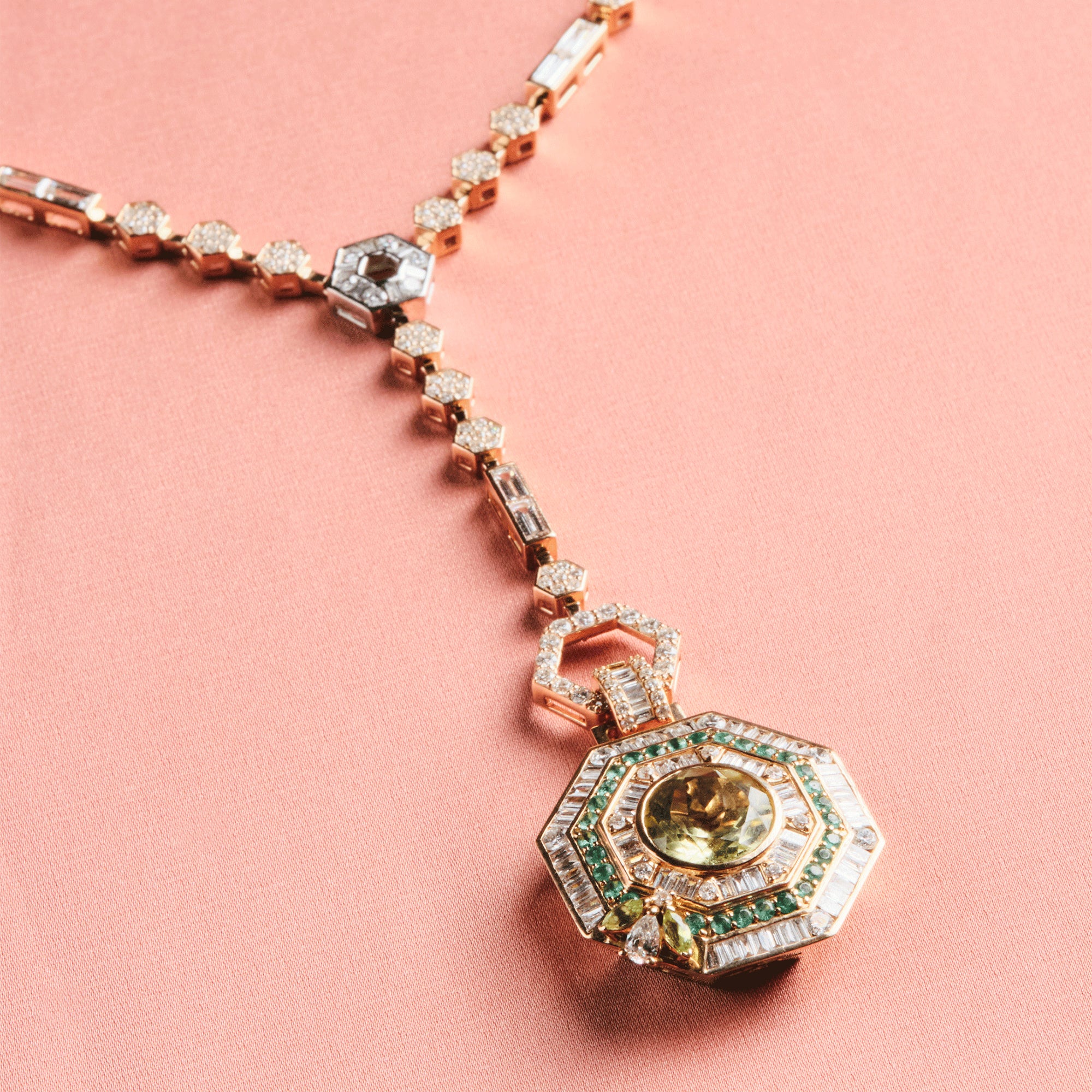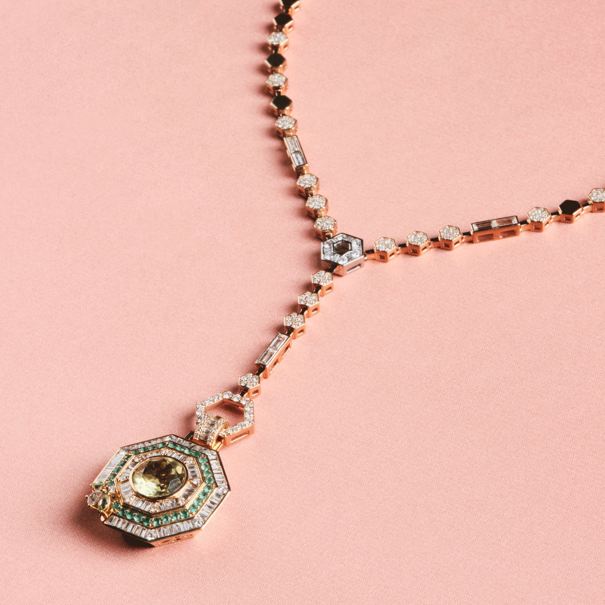 Embrace the transformative energy of the cosmos with the Honeycomb Pendant, an exquisite talisman crafted from 18K rose gold and adorned with the enchanting brilliance of 1.65 carats of G-VS-SI diamonds, complemented by the verdant allure of emeralds and the uplifting glow of peridot. This pendant, shaped like the honeycomb— a sacred hexagon symbolizing the heart—invites you to delve into the mysteries of creation and the sweet nectar of life. Like the humble bee that extracts wisdom from the ephemeral, let this pendant inspire you to transform your experiences into a source of abundance and enlightenment. Each gemstone radiates a unique energy: the emerald for love and renewal, the peridot for joy and vitality, and the diamond for clarity and strength. Wear this piece as a reminder of your divine connection to nature's bounty and your inner goddess. Step into your power, celebrate your journey, and let the Honeycomb Pendant illuminate your path to bliss and unity. Adorn yourself with this exquisite symbol of initiation and let your spirit soar.